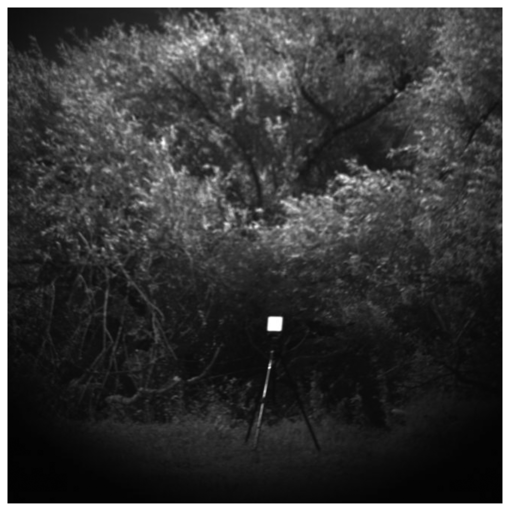 Figure 6 shows the image at the 720 nm wavelength of the hyperspectral cube of Salix 4 in Location 2 (each hyperspectral cube was built with 141 images ranging from wavelengths of 400 nm to 1,800 nm with a step of 10 nm). The reference standard (Spectralon) introduced in the scene for data radiometric calibration is also visible in Figure 6.