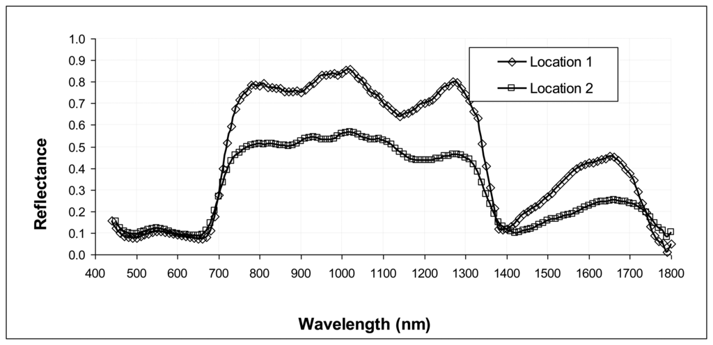 The average spatial resolution for the entire dataset was 0.28 cm/pixel. Tree samples at Locations 1 and 2 exhibit a characteristic behavior of the spectral reflectance in the range 400–1,800 nm, as illustrated in Figure 7. Since trees in both locations presented dense foliage, the spectral signatures have been derived by averaging the reflectance over an area comprising a large number of leaves without branches or background. The spectral signatures were substantial identical varying the dimension of the area, assuring only leaves were included. This ensures the radiometric calibration was properly performed.