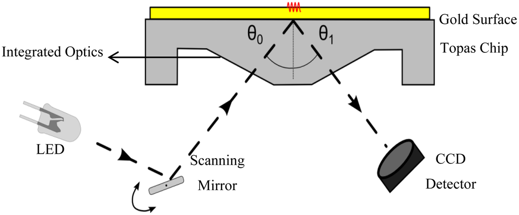 The optical phenomenon of SPR occurs on the interface between a metal surface and a dielectric. When light strikes the surface of a certain metal, there is a minimum of the reflected light intensity. The angle of this minimum (resonance angle, θ) is a property of the plasmon resonance and depends on the refractive index of the medium and the wavelength used. The adsorption of molecules to this interface results in a change of the refractive index, which can be detected as a shift of the resonance angle. The change in angle is reported as resonance units (RU): one unit corresponds with the binding of 1 pg of analyte per mm2; an angle change of roughly 0.1° corresponds to 1,000 RU. The SPR measurements in this study were performed using the SPR measurement system, developed by Fraunhofer and sold by capitalis technology GmbH (Berlin, Germany). The system consisted of an SPR-read-out unit, combined with an automated on-chip microfluidic system. For the SPR measurements, commercially available, disposable, 76 × 26 × 4 mm3 (equal in area to a standard microscopy slide) sensor chips were used, that were molded from a cyclic olefin copolymer referred to as Topas® (KDS Radeberger Präzisions-Formen-und Werkzeugbau, Radeberg, Germany). An area of 12 × 3 mm2 on the chip surface was covered with a 50 nm thick gold layer, serving as the metal interface onto which antibodies are grafted. The angle of incidence of collimated light from light emitting diodes (LEDs with a wavelength of 810 nm) was scanned over the underside of the gold area of the chip, through a scanning mirror. The reflected light was detected by a high resolution CCD camera. This is schematically represented in Figure 1. A CPU controlled syringe pump (MLE, Dresden, Germany) was used to administer fluids with programmable flow rates, ranging from 1.25 to 689 μL/s.