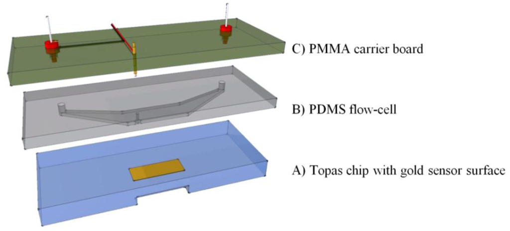 To combine the surface plasmon resonance setup with the impedance spectroscopy unit, a flow-cell was developed. This cell was designed to match the dimensions of the existing Topas® chip. The dimensions are 76 × 26 × 4 mm3, a patch of gold (12 × 3 mm2, with a thickness of 50 nm) is deposited on top of the slide. The chip is shown in Figure 2A. A PDMS (polydimethylsiloxane) flow-cell is key to achieve a successful combination between the two technologies. PDMS is a transparent flexible silicone elastomer, it is biocompatible and has a high degree of chemical inertness. Its reusability and self-sealing properties make it an ideal material for this application. Figure 2B shows the PDMS flow-cell. To fabricate this cell, a mold is fabricated in PTFE (polytetrafluoroethylene/Teflon; PCH Technischer Handel, Dresden, Germany) to serve as the master template, through computer numerical control (CNC) milling [25]. This master mold is then encapsulated in the PDMS base polymer (Sylgard 184, Dow Corning, Midland, MI, USA), which is mixed thoroughly in a 10:1 ratio with its curing agent. The mixture is degassed for 30 min at an absolute pressure of 50 kPa to remove trapped gas bubbles. Complete curing of the PDMS in an oven at 65 °C takes approximately 3 h. The cured daughter-mold can be gently peeled from the master template and cut to the required dimensions with a lancet. Cavities for the inlet, outlet and spring contact are present in the master mold, so no post-treatment to the PDMS mold is necessary. The resulting reaction-chamber of the flow-cell is positioned directly over the gold patch. A small part of the gold sensor surface is sacrificed to allow a gold plated spring contact to make a connection without any contact with the fluid compartment. The spring contact is pressed gently onto the gold surface of the Topas® chip, ensuring a good electrical connection. As the second connection, a gold wire with a diameter of 500 μm is placed in the outlet compartment of the flow-cell, closing the electrical circuit from the spring contact, to the gold plated patch, through the reagents, to the counter-electrode and finally back to the impedance analyzer. The PDMS flow-cell is permanently bound to a transparent polymethylmethacrylate (PMMA) carrier board. This board acts as a strain relief for the electrical connections and has integrated HPLC (high performance liquid chromatography) fittings to simplify the fluidic handling, as shown in Figure 2C.