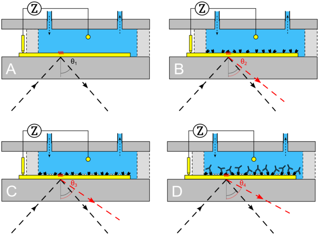 After achieving a successful proof of principle a usability test was conducted. It was studied whether the binding of IgG1 (Sigma-Aldrich Biochemie GmbH, Taufkirchen, Germany) to Protein A (biopur, Reinach, Switzerland) could be observed, both by EIS and SPR in real time. First, the gold patch of the Topas® chip is cleansed by means of a 65% HNO3 solution then it is neutralized in a solution containing 25% NH3, 30% H2O2 (all three purchased at Carl Roth) and ultrapure water (Direct-Q3 UV system—Millipore, Schwalbag, Germany) in a ratio of 1:1:5 for 2 min. Subsequent rinsing with ultrapure water and drying under N2 atmosphere finalized the cleaning procedure. After this cleaning procedure, the Topas® chip, PDMS flow-cell and PMMA carrier board are assembled. First, the reaction chamber was filled with 500 μL of 10 mM Tris-HCl solution (Figure 3A), to obtain a stable signal for both EIS and SPR. Next, 500 μL of 0.25 mg/mL Protein A solution was added and left for 90 min to be adsorbed to the gold surface (Figure 3B). In the next step, the gold surface was rinsed with 500 μL of 10 mM Tris-HCl solution, to remove the unbound Protein A. When a stable signal was obtained, 500 μL of 1 mg/mL BSA solution was added for 20 min, to block the unoccupied areas of the gold surface (Figure 3C). Then, the system was rinsed again with 500 μL of 10 mM Tris-HCl solution. Upon observing a stable signal, 500 μL of 0.565 mg/mL IgG1 solution was added to the reaction chamber, to bind with the Protein A, for 90 min. Finally, the system was rinsed with 500 μL of 10 mM Tris-HCl solution.