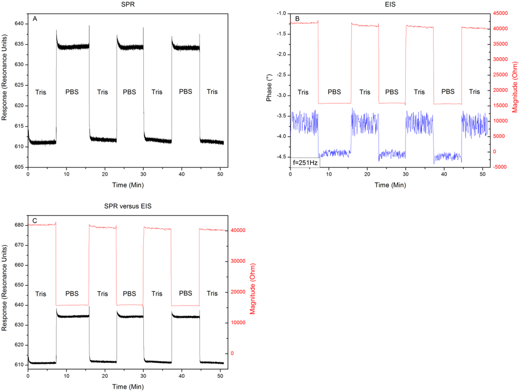 Figure 4 shows the results when exchanging the media 10 mM Tris-HCl and 1× PBS buffer for three consecutive runs. The response to an exchange of buffer media can be seen in Figure 4A. Filling the reaction chamber with 10 mM Tris-HCl provides a local minimum of 610 ± 2 RU. Replacing this solution with 1× PBS buffer provides a local minimum in the intensity of reflected light of 635 ± 2 resonance units (RU). When repeating this medium exchange it can be seen that this result is highly reproducible with minor signs of drift. Figure 4B shows the changes in impedance and its phase at a frequency of 251 Hz, while exchanging the media. The 10 mM Tris-HCl solution provides a complex resistance of 40 kΩ ± 58 Ω and an accompanying phase of −3.7 ± 0.4°. When exchanging the 10 mM Tris-HCl solution with 1× PBS, the impedance decreases to 15.5 kΩ ± 35 Ω with a phase shift towards −4.4° ± 0.1°. Repeating the medium exchange for three consecutive runs shows again a high reproducibility of the values mentioned above with little drift or increasing error on the signal. To assess whether the EIS and SPR unit detected the media exchange at the same time, the minimum shift from Figure 4A and changes in impedance, depicted in Figure 4B are plotted in one graph as can be seen in Figure 4C. Comparing the signals, when plotted together in the same graph, reveals that the units detected the media exchange at the same time, without any signs of crosstalk or influencing each other. The results of the proof-of-principle test, described in Section 3.1 reveal that, when changing the medium from 10 mM Tris-HCl to 1× PBS and then back to 10 mM Tris-HCl, little shift in response or impedance occurs when comparing the 10 mM Tris-HCl plateaus. When comparing the effect sizes, very low noise levels can be observed in the SPR and EIS magnitude data. However the EIS phase data appears to be noisy. Exchanging media provides a predominantly resistive effect, which explains the minor change in phase (±1°). Having an error of ± 0.5° will therefore lead to a high noise level when compared to the small effect size.