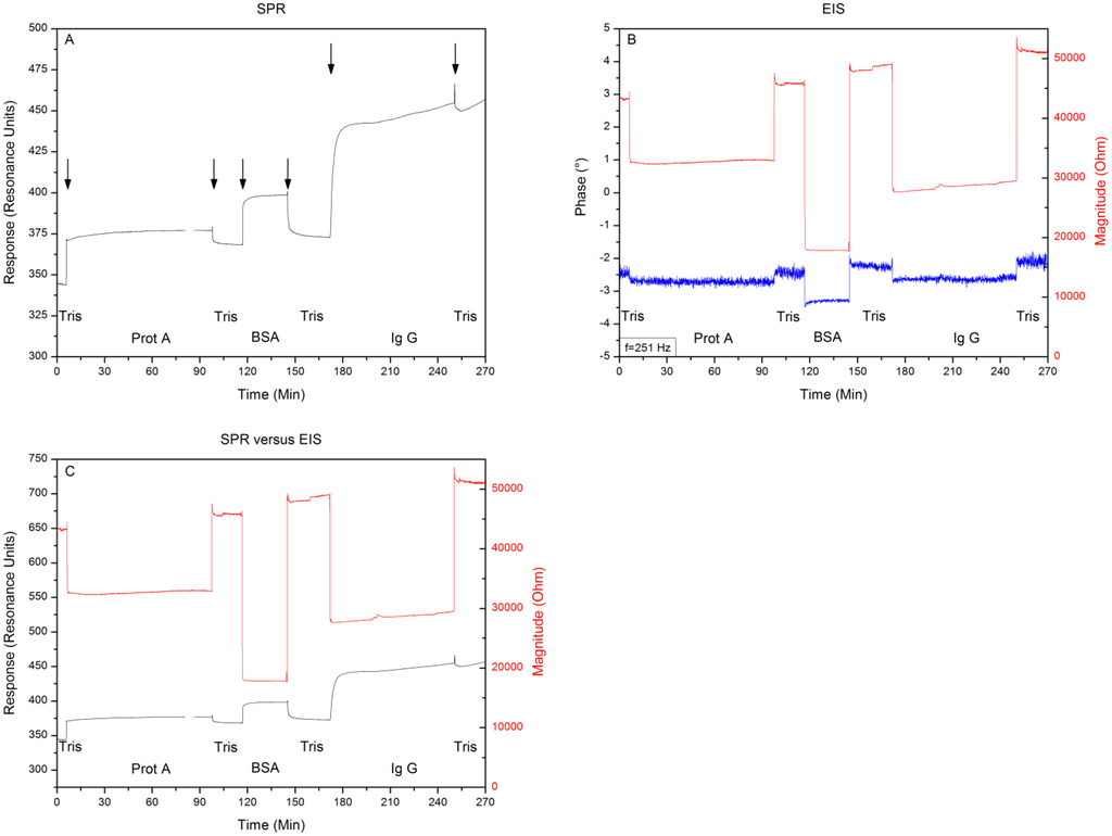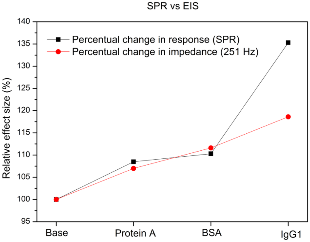 In this study we explored the possibility of combining two different read-out techniques (EIS and SPR). After establishing a combined setup (Figure 2), a proof of principle experiment was conducted. 10 mM Tris-HCl and 1× PBS buffer was introduced in an alternating manner to the reaction chamber of the PDMS flow-cell. The results have shown that these media changes could be detected both by EIS and SPR and when changing the medium from 10 mM Tris-HCl to 1× PBS and then back to 10 mM Tris-HCl, no shift in minimum or impedance occurs. Plotting the results in one graph (Figure 4C) revealed that EIS and SPR detected the changes simultaneously, without any evidence of crosstalk. After the successful proof of principle experiment a usability test was conducted with Protein A as receptors and IgG1 as target molecules. The possibility to detect the binding of IgG1 to Protein A simultaneously by EIS and SPR was investigated. Comparing the 10 mM Tris-HCl plateaus between additions provided the net effect of each addition and excluded any media effects. Figure 6 illustrates the percentual effect sizes for EIS and SPR for each addition.