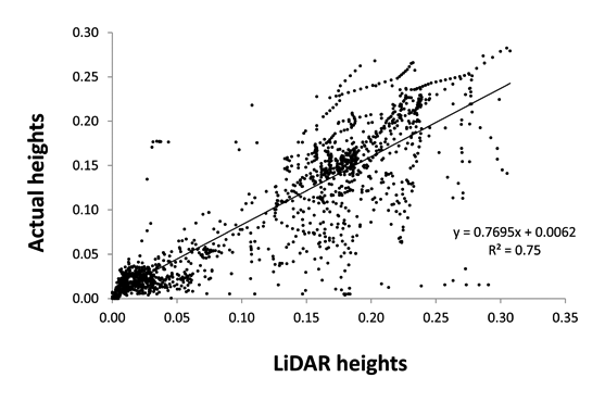 A linear relationship between LIDAR measured heights and actual plant heights was found, proving the accuracy of the method for plant height determination. The results showed a strong correlation between actual heights and LIDAR heights, with an R2 = 0.75 (Figure 2). However, actual height, as well as weed densities were not well correlated with LIDAR reflection values (data not shown). Although the reflection values did not show a high relationship with heights (LIDAR and actual heights), the values could reproduce the vegetation profile (Figure 3), and its use could improve the accuracy. Furthermore, this study proves that bright colors (green color from vegetation) belong to high reflection values accentuated by the chlorophyll activity. Thus, the reflection value represents object information close to the intensity of color.