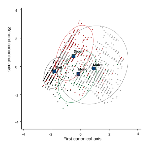 The CDA could separate between vegetation areas from bare soil with a lower success than the logistic regression. However, the analysis proved that the discrimination between four types of situations, (a) monocots; (b) dicots; (c) crop and (d) soil, was possible, with an overall success of 72.2%. The cases of soil (d) were correctly classified with 92.4% of accuracy. Dicots (b) were properly classified in 64.5% of the analyzed cases, with all misclassified cases distributed between the other groups. The presence of monocots (a) was poorly classified, mainly because it was identified as crop. In addition, the predictions for crop (c) presence showed good results, with 74.3% of cases integrated in the right group (Table 2). The canonical discriminant function plot (Figure 4) identified differences between groups. The centroid of soil (d) was clearly separated from the rest of the centroids. In addition, the centroid of dicots (b) was clear from the rest of the groups, with some overlapping with crop (c) and monocot (a) groups. The centroid of these two groups, crop (c) and monocots (a), presented some discrimination. However, some overlapping was present between them, containing some of the misclassified samples.