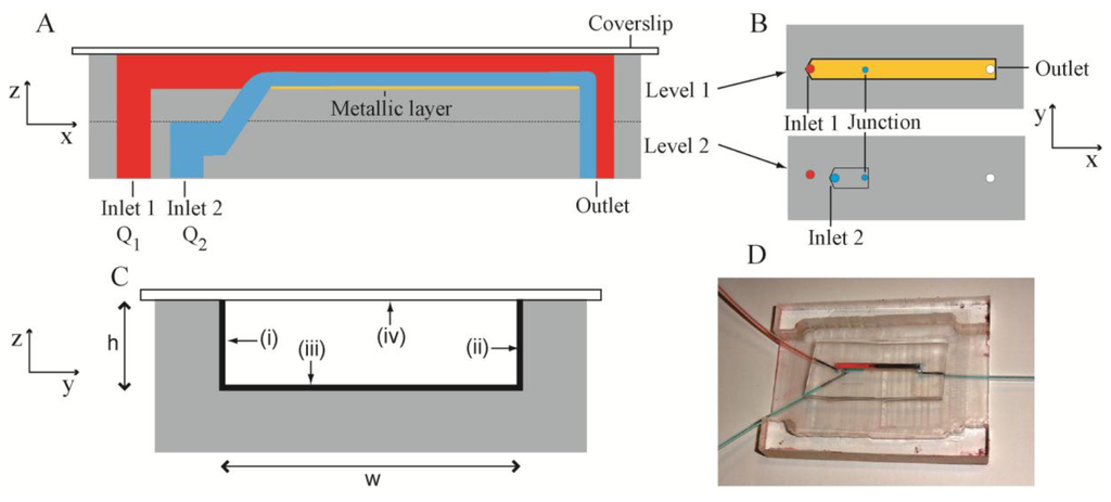 The present microbioreactor was a two-level system (Figure 1A) fabricated in PDMS. The channel structures were fabricated by casting uncrosslinked PDMS against a silicon mould with patterned photoresist features. These features had the inverse dimensions of the required channels, but resulted in the required channel dimensions in the PDMS following casting. Levels 1 and 2 consisted of channels with dimensions of width w = 2 mm, height h = 305 μm and length l1 = 32 mm and l2 = 9 mm, respectively (Figure 1B). The two levels were aligned and bonded such that the channels therein were collinear and there was overlap between them. A cylindrical junction was formed between the overlapping segments using a punch (diameter = 500 μm). The punch angle was 45 degrees, such that the liquid entering the channel in Level 1 had some component of its velocity in the x-direction in order to: (i) keep the biofilm precursor stream close to the bottom of the Level 1 channel; (ii) reduce shear forces between the two streams and (iii) maintain smooth laminar flow. Level 1 channel was sealed by a glass cover slip with thickness of 170 μm, which matched the working distance of the Raman spectrometer system. Confining liquid (pure water) and biofilm precursor liquids (bacterial inoculants and citrate solutions) were introduced into Level 1 and Level 2 channels via Inlet 1 and Inlet 2, with a flow rate Q1 and Q2, respectively. Figure 1C shows a cross-section of the sealed Level 1 channel with three metalized channel walls and the glass sealing layer. Characterization took place against the bottom surface in Level 1. The entire assembled bioreactor is shown in Figure 1D.