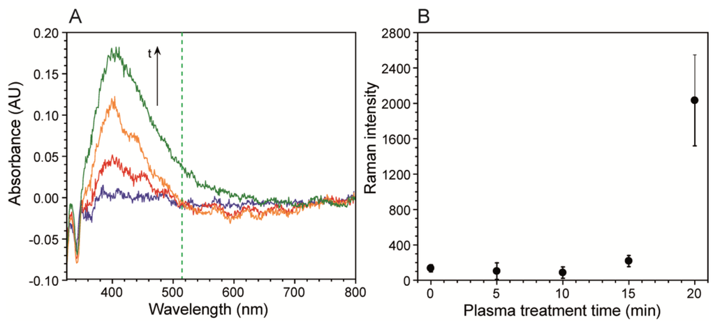 As seen in Figure 2A the band is near 400 nm, as expected for silver. Figure S2 shows the results of the mathematical deconvolution of this peak into three distinct absorption bands, which included the main band at 397 nm, and two smaller bands at 439 nm and 466 nm. Figure S2 shows the evolution of the individual band intensities with plasma exposure time, which featured a high initial slope followed by a plateauing after long exposure times, resembling the Ra response. The band broadening occurred on the low frequency side, due to the growth of two secondary bands. It was primarily the low frequency tail of the 466 nm band, which overlapped with the 514.5 nm Raman excitation source. We followed the resulting SERS intensity of a 5 mM citrate solution after five different plasma treatment times. Figure 2B shows that intensity of the νC-COO citrate band was nearly unchanged at exposure times of 15 min or less, but increased after that. This corresponded to the spectral density increases at the Raman laser excitation frequency shown in Figure 2A. Future optimisation should include longer plasma exposure times, to maximize Ra, and the use of higher frequency excitation lasers, to achieve better overlap with the silver absorption band.