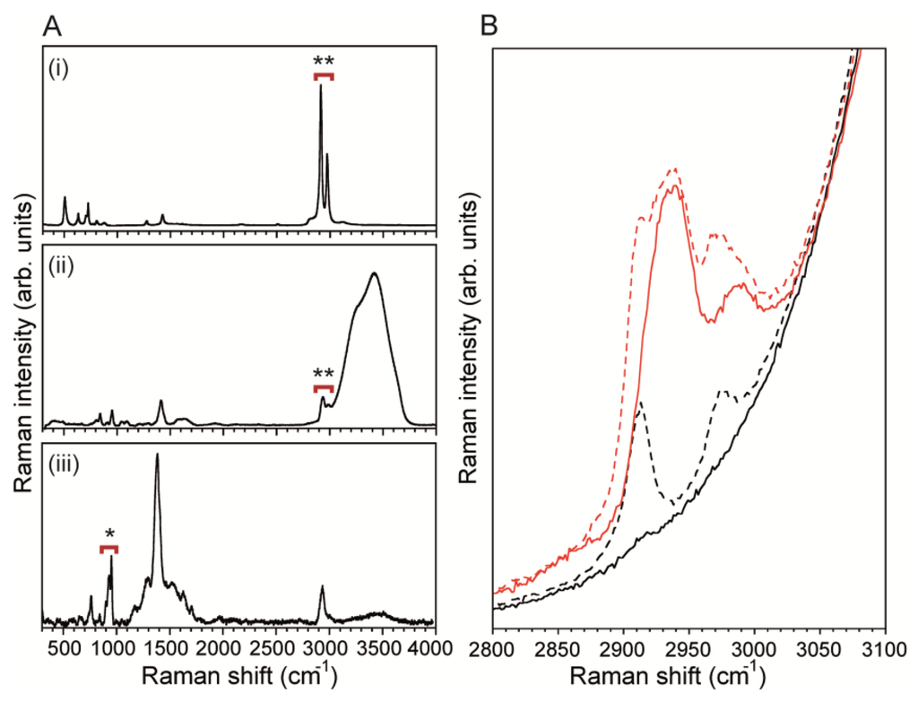 The MF bioreactor described here was designed to confine and measure the biofilm precursor flow streams along the channel wall where measurements are taken. Due to the close proximity of the channel wall and the analyte molecules, the SERS surface should both enhance sensitivity and block background signals originating from the PDMS channel wall. The latter was critical because PDMS CH3 symmetric and asymmetric stretching bands (2,907 cm−1 and 2,967 cm−1, respectively) [] overlap with signals from most organic molecules, such as citrate CH2 symmetric and asymmetric stretching (2,935 cm−1 and 2,986 cm−1, respectively) (Figure 3A) []. For example, measurements of pure water in the absence of an opaque silver layer at the channel wall revealed νCH3 bands from PDMS even in when the confocal measurement point was displaced 50 μm above the channel surface wall (Figure 3B). Even absorption bands from a 500 mM sodium citrate solution were significantly blocked by PDMS νCH3 bands. Therefore, SERS surfaces required a continuous opaque metal layer along the channel wall, such that no laser excitation radiation could reach the underlying PDMS. This eliminated interfering PDMS bands, revealing the true spectral characteristics from pure water and the 500 mM sodium citrate solution.
