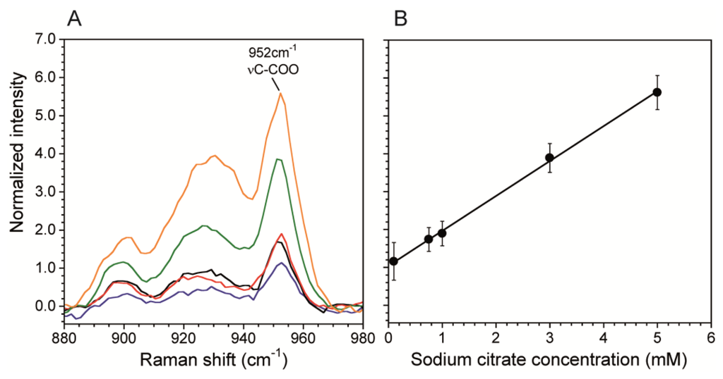 A calibration curve correlates Raman scattering intensities to known chemical concentrations in order to quantitatively determine concentrations in unknown solutions. This is particularly important when using SERS surfaces in microchannels because the plasmonic enhancement is very sensitive to the SERS fabrication technique. We generated a calibration curve using the citrate band associated with νC-COO at 952 cm−1 (Figure 4A). We chose this band over the vCH2 because it was stronger and did not have any overlap with vO-H band from water, which we used for normalization. Figure 4B shows the normalized intensity of the 952 cm−1 band. The curve was collected at the SERS surface prepared as described in Sections 2.2 and 2.3 using data acquisition time t = 60 s, laser power P = 10 mW. The total flow rate Q = 0 mL/hr was used to eliminate any flow induced cooling, thereby demonstrating the benefit having a low P, which resulted in no heat-induced bubble formation. Other measurements using P = 100 mW resulted in bubble formation at the channel wall except at high flow rates. In addition, the reduction in energy supplied to the system enabled by SERS, should also strongly reduce other negative effects related to analyte heating, such as photodegradation of analyte molecules and flow distortions due to thermal driven convection cells resulting from heating of the SERS surface at the bottom of the channel. On the other hand, Figure 5B shows the resulting linear calibration curve in the concentration range 0.1 mM and 5 mM. We did not calibrate for lower concentrations because this range was sufficient for the current work, and non-linearities may exist outside of this range [,]. Therefore, concentrations below 0.1 mM can only be used for qualitative purposes. For comparison, without the SERS substrate, the limit of detection was 10 mM for acquisitions of t = 600 s at laser power of P = 250 mW. The enhanced sensitivity in the sub mM range will enable future kinetic studies into biocatalytic degradation of citrate by biofilms. Moreover, the large reduction in acquisition time allows faster generation of spectral images with better spatial resolution.