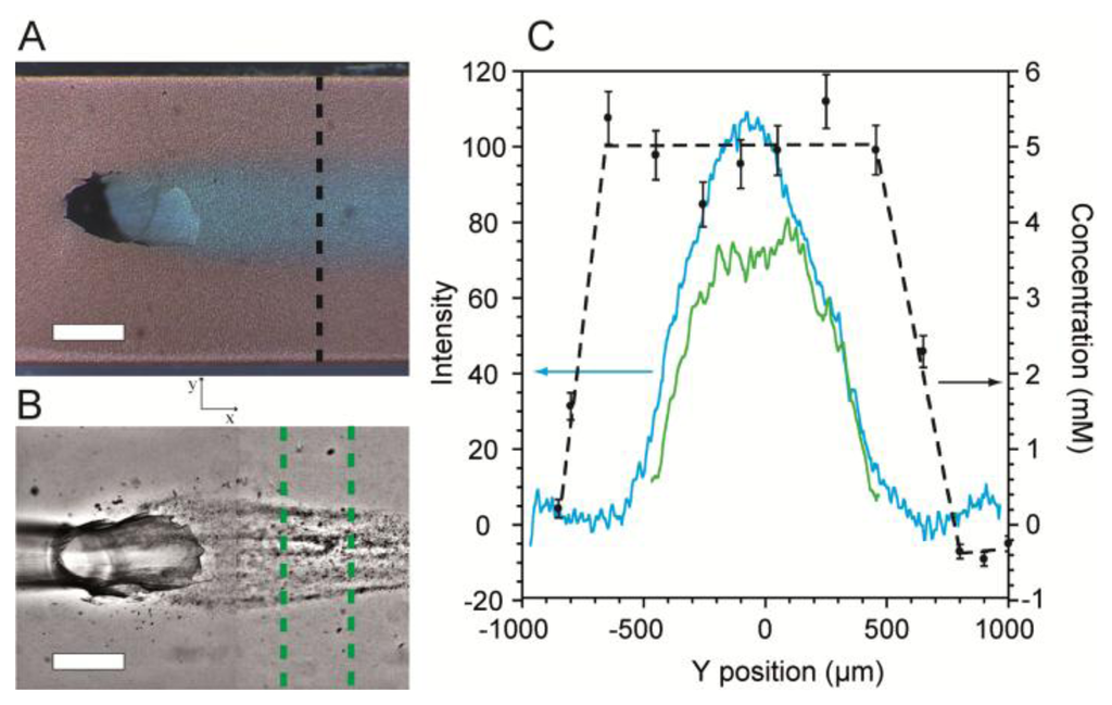 The optical density profile of the templated biofilm from Figure 5B is also plotted in Figure 5C. As expected, biofilm growth was confined to the centre of the channel where the concentration of citrate was non-zero. We note that the biofilm profile followed approximately the same trend as the citrate optical density profiles rather than the citrate SERS profiles. From this information, we deduce that the height of the precursor solution layer near the precursor/confinement solution interface must be too small to provide sufficient nutrients to adsorbed bacteria, thereby preventing growth. This approach can be used in future studies to gain further insights regarding MF studies of biofilms as well as other chemical or biochemical phenomena occurring at microchannel walls.