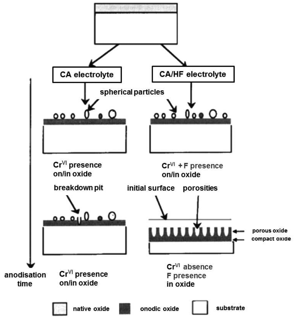 Preparation of titania tubular arrays by means of the anodization method in chromic acid solution both without and with hydrofluoric (HF) acid addition was performed for the first time by Zwilling et al. in 1997 [48,49]. The potential between the specimen and a titanium cathode was increased from 0 to 5 or 10 V in five equal steps of 1 min each. Zero volts means that the anode and the cathode were short-circuited. Then the specimen was maintained at the final voltage for variable times ranging between 1 and 55 min; some experiments were performed by reaching the final voltage in a single step. Non-porous oxide compact films were formed after the anodization of titanium and titanium alloy in chromic acid without HF and a duplex film composed of a compact layer surmounted by a columnar porous layer have been formed in chromic acid containing HF. When fluorine was not present the Cr(VI) species played a poisoning role and stopped the growth of the compact non-porous layer formed in chromic acid media (Figure 2) [49].