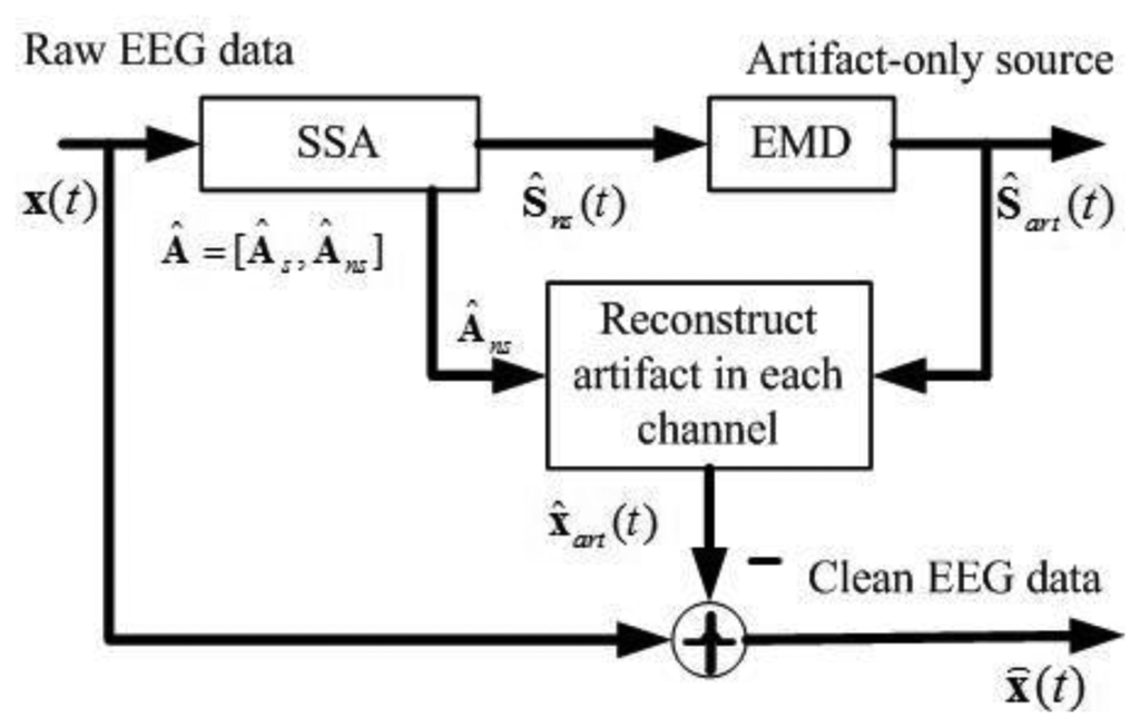 Figure 1 shows the block diagram of the proposed approach. It comprises the following key steps: (1) apply SSA to obtain the components containing artifacts Ŝns(t) ; (2) apply EMD on such components to separate the artifact-only components Ŝart(t) and the cerebral activity that has leaked to Ŝns(t); (3) project the artifact-only components back to each channel for estimating the artifacts, and then subtract the estimated artifacts X̂art(t) from the raw EEG recordings to get a clean EEG.
