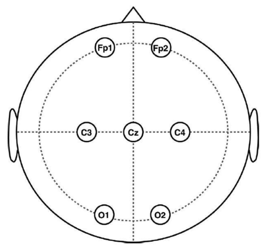 Forty healthy volunteers, 20 males and 20 females, aged between 20 and 33 years (mean age 27.6 years) were involved in the study. The EEG signals were recorded on 20 volunteers with the NeuroScan SynAmps2 system. Six EEG channels (Fp1, Fp2, C3, C4, O1, O2) were used for recording and the ground electrode was placed at position Cz, according to the 10–20 system (Figure 2). To obtain pure EEG data to be artificially contaminated, a 50-s consecutive epoch, where there were no obvious artifacts according to a careful inspection, was recorded for each volunteer in an eyes-closed session. Signals were digitized at a rate of 250 Hz, band-pass filtered at 0.5–50 Hz and notch filtered at 50 Hz.