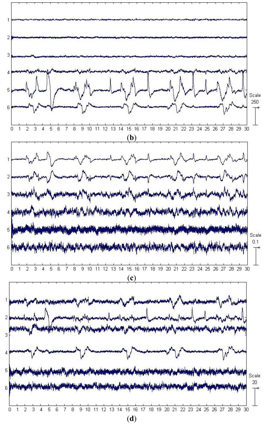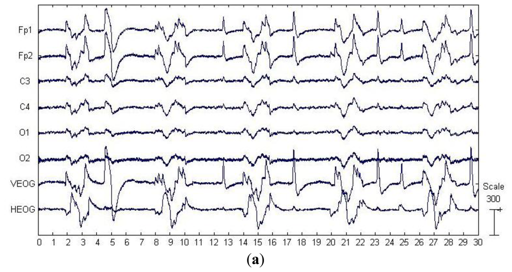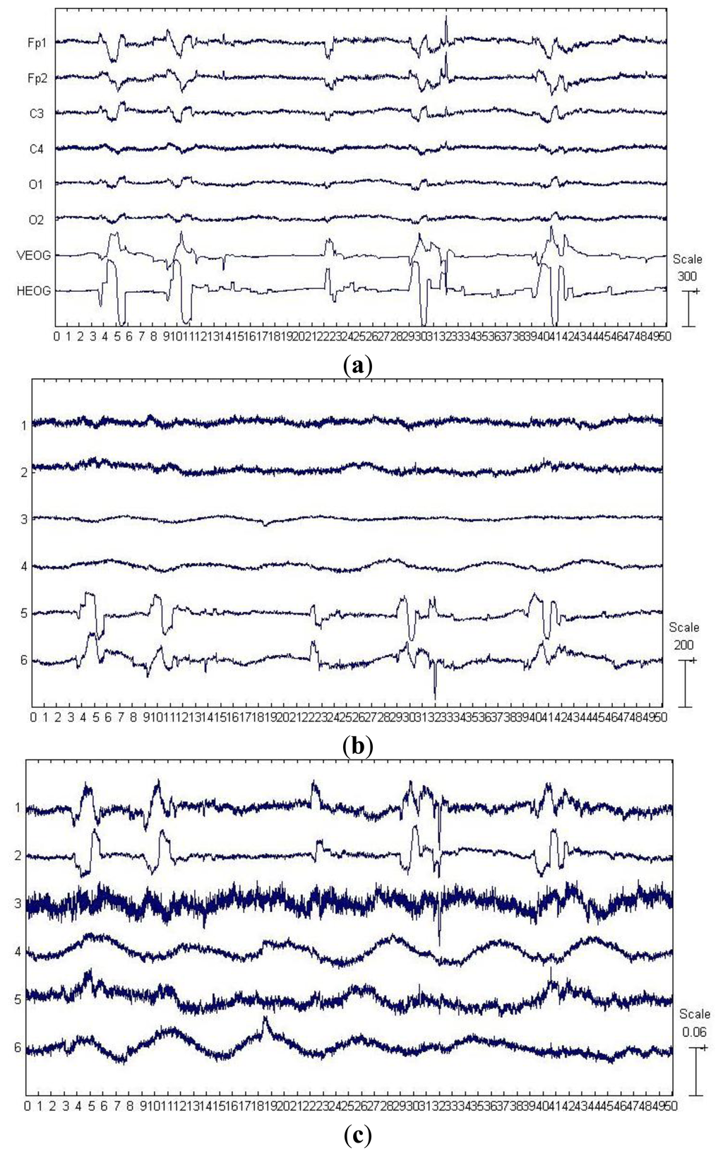 The first six channels in Figure 3a depict an example from one of the 20 artificially contaminated EEG signals, while the last two channels show the corresponding VEOG and HEOG used to generate the mixed signal. The eye movement and blink artifacts appear in EEG as big pulses localized in time and have a strong impact to EEG signals. Besides, the eye movement and blink episodes spread over all channels and affect most strongly the frontal sites (Fp1, Fp2).