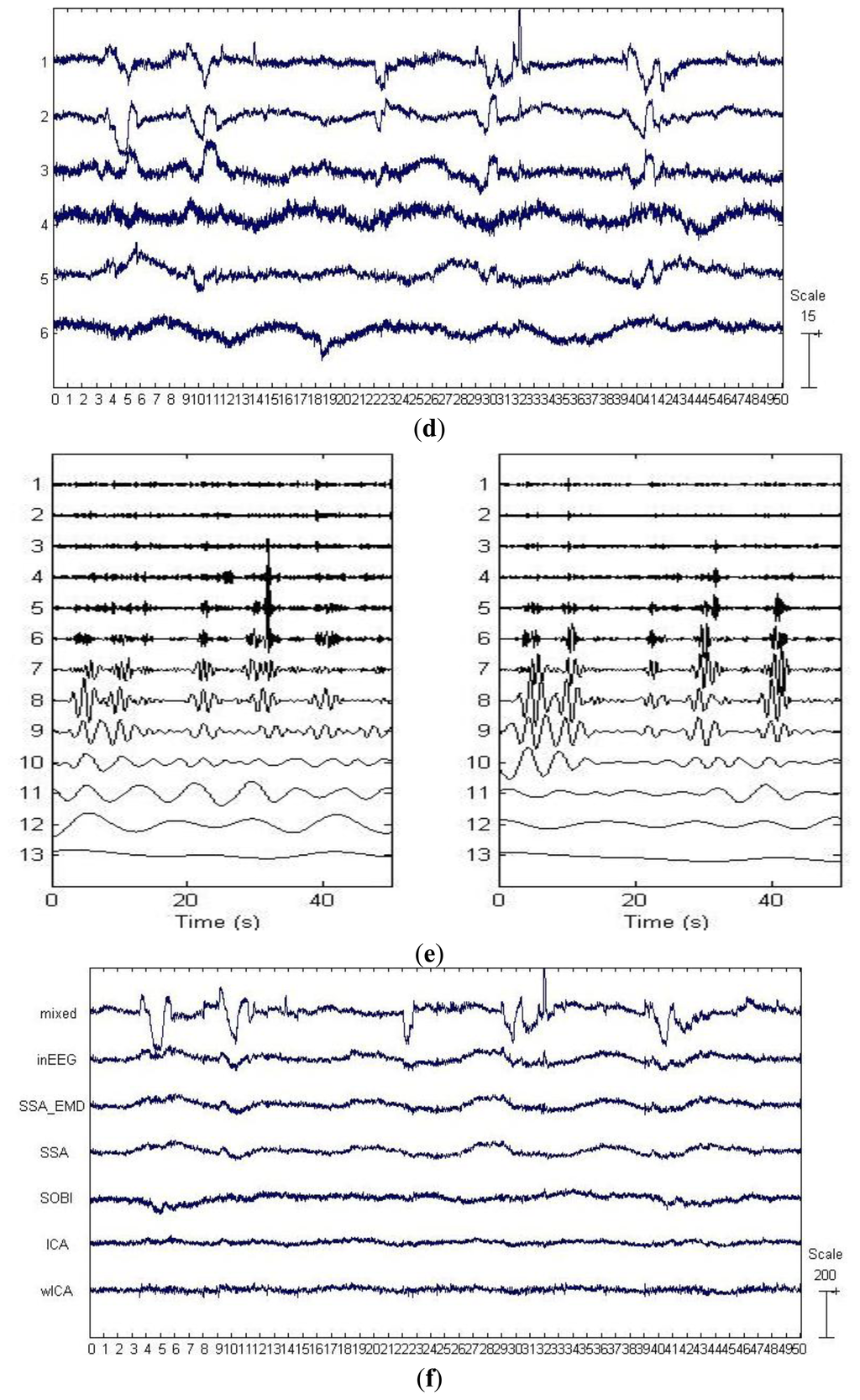 By applying SSA on the EEG data on the first six channels shown in Figure 3a, six components were obtained and depicted in Figure 3b. The last two components in Figure 3b were identified as the artifactual ones by ADJUST, which were strongly non-stationary, featuring abrupt pulses with large amplitude and short-duration. By observing the HEOG and VEOG signals that propagated onto the six EEG channels, we found that the last two artifactual components actually reflected the horizontal and vertical motion of eyes, respectively. Furthermore, these two artifactual components carried appreciable brain activity as well (see Figure 3b). Then EMD was applied on these two components for denoising them, and the resulting IMFs for each component are shown in two subfigures of Figure 3e. It can be observed that the relatively high oscillation both appears in the 1st IMF, the 2nd IMF and the 3rd IMF, which are likely to be associated with the cerebral signals. Thereby, the remaining IMFs of each artifactual component were summed together to reconstruct the artifact-only one. Finally, the artifact-only components were projected back to each channel for estimating the artifacts, and then the corrected EEG data were obtained by subtracting the estimated artifacts from the raw EEG recordings.