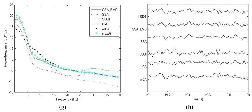 This real EEG recording has the same three characteristics as the artificially contaminated EEG signals. Both SOBI and ICA again failed to concentrate the artifacts in fewer components on this data set. Although SSA captured the eye blink and movements in only two components, such components also contained neural activity aside from the artifacts. Therefore, the removal of the contaminated components, followed by a signal reconstruction has led to distortions of the underlying cerebral activity (see Figure 4g). Nevertheless, by denoising the artifactual components found by SSA with the adaptive decomposition method EMD, the residual neural information was effectively recovered (see Figure 4g). Though wICA also attempted to recover the cerebral activity from the components by ICA, it only suppressed the blink artifacts with high amplitude (see Figure 4f) but still left over many eye movement artifacts. It is the manually set wavelet decomposition basis that might be blamed, which may only fit the eye blink artifacts well but may not match the eye movement ones with much more complicated localized temporal structures.