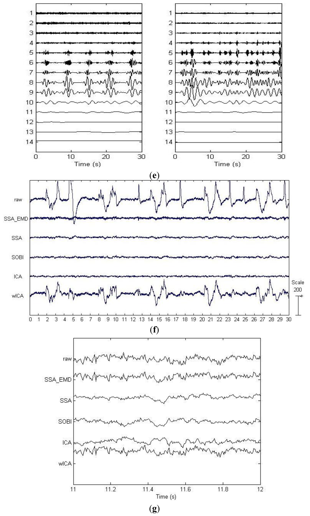 Figure 4f presents the visual comparison of the raw real EEG recording and the corrected EEG recording on Fp1 channel by different ocular artifacts correction methods. The EOG artifacts are effectively suppressed by all the five methods, except wICA, which has only suppressed the blink artifacts with a large amplitude and short-duration, but left over many eye movement artifacts in the corrected signals. Moreover, by observing zoomed signals during an artifact-free epoch in Figure 4g, we can find that SOBI, ICA and SSA have introduced considerable distortions, i.e., the activities of high frequency in the original raw EEG signal have disappeared. In contrast, it is observed that SSA_EMD has effectively corrected the ocular artifacts without altering much of the high frequency cerebral activity.