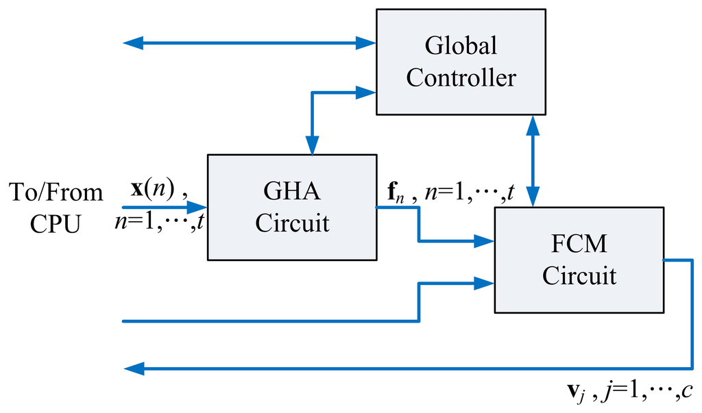Figure 1 shows the proposed architecture for spike sorting, which contains the GHA unit, FCM unit and global controller. Based on spikes x(n), n = 1, …, t, the GHA unit is used for computing feature vectors fn, n = 1, …, t. The FCM unit then computes centers vj, j = 1, …c, for clustering. The global controller coordinates all the components in the architecture.