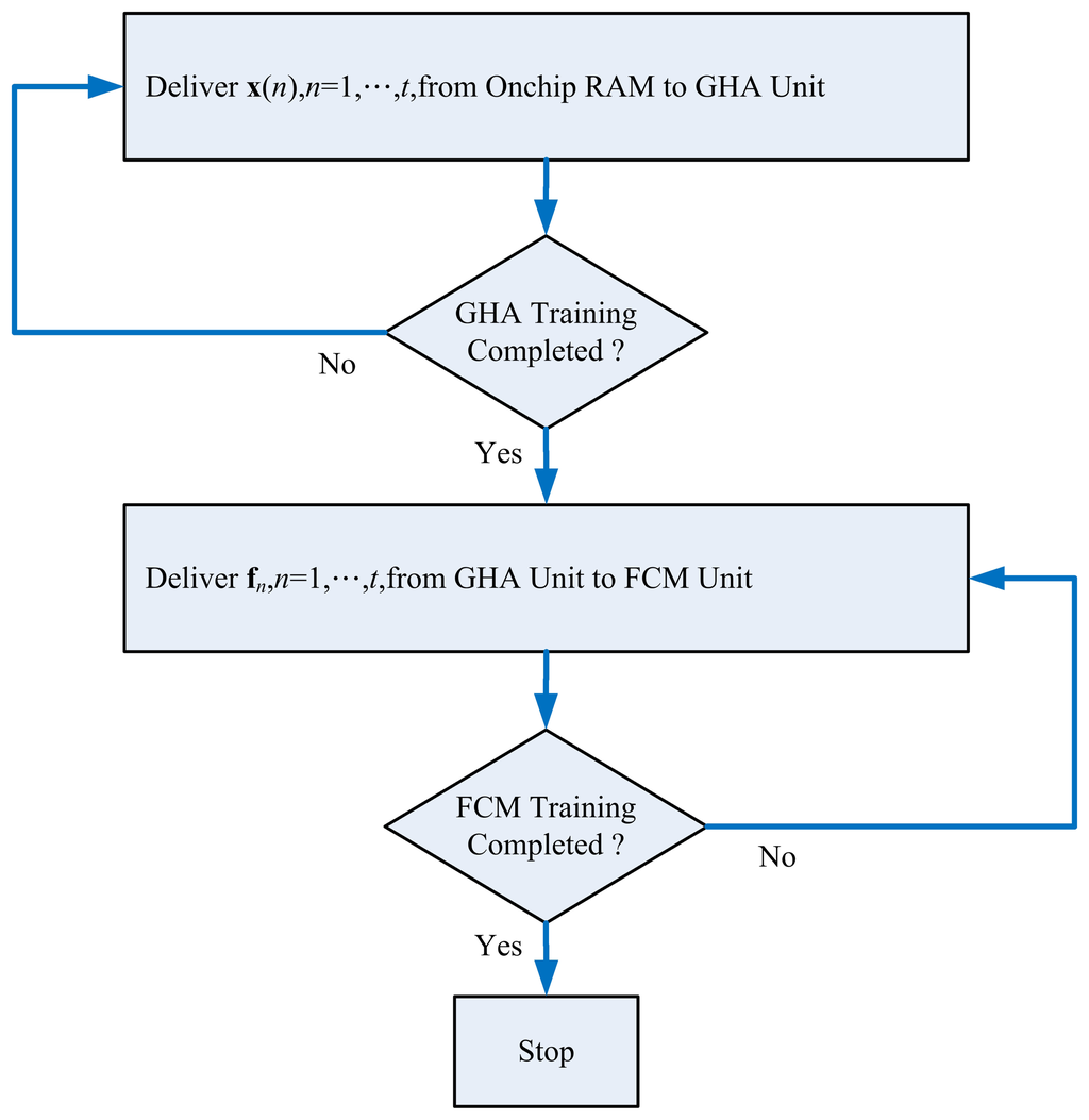 After the training process of the GHA circuit is completed, Buffer C contains the synaptic weight vectors, w1 and w2. Based on the synaptic weight vectors, the feature extraction operations can then proceed, which are the same as those shown in Figure 6 for PCC operations. The computation results are stored in Buffer D as feature vectors fn, n = 1, …, t, for the subsequent FCM clustering operations.