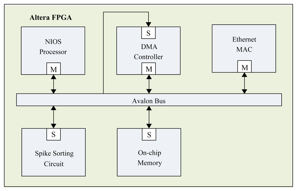 The proposed architecture is used as a custom user logic in an SOC system consisting of a softcore NIOSCPU [26], DMAcontroller, Ethernet MACcontroller and on-chip RAM, as depicted in Figure 11. In a typical spike sorting system, there are three operations: spike detection, feature extraction and clustering; as shown in Figure 12. The nonlinear energy operations (NEO) and thresholding can be used for the spike detection, which is implemented by software running on a NIOS softcore CPU. The operations supported by the proposed architecture are feature extraction and clustering. All the detected spikes are stored in the on-chip RAM and then transported to the proposed spike sorting circuit for both feature extraction and clustering. The DMA-based training data delivery is performed so that the memory access overhead can be minimized. The softcore NIOS CPU coordinates different components in the SOC. It is responsible for circuit activation and control. The results of feature extraction and clustering are stored in the memory unit of the GHA and FCM circuits for subsequent operations.