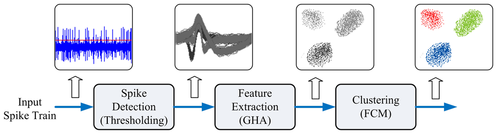 The GHA and FCM can be used for feature extraction and clustering of spikes, respectively. To use GHA for feature extraction, the x(n) in Equation (2) is the n-th spike in the spike train. Therefore, the vector dimension, m, is the number of samples in a spike. Let: