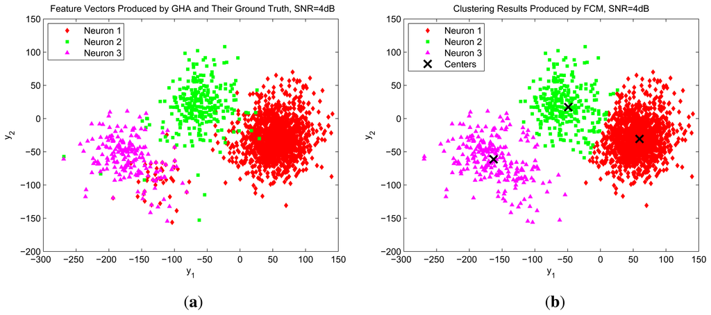 To further elaborate the effectiveness of the GHA and FCM algorithms for spike sorting, Figure 13 shows the distribution of GHA feature vectors of spikes for SNR = 4 and the results of FCM clustering. The center of each cluster produced by FCM is also marked in the figure. By comparing Figure 13a with Figure 13b, we see that the proposed GHA and FCM circuits are able to correctly separate spikes, even for large noises.