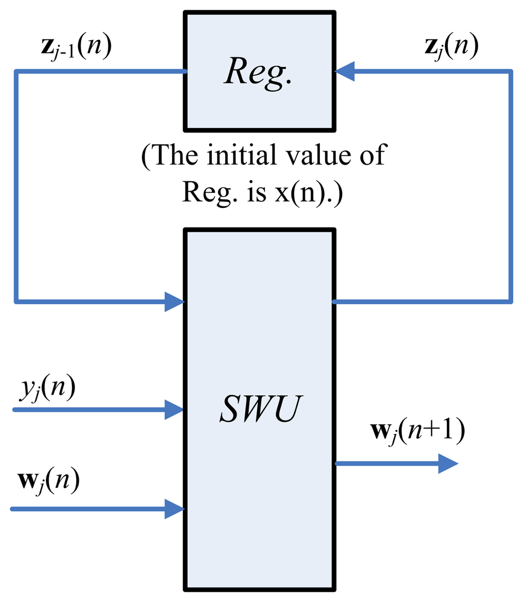One way to implement the SWU unit is to produce wj(n + 1) and zj(n) in one shot. However, m identical modules, individually shown in Figure 3, may be required, because the dimension of vectors is m. The area costs of the SWU unit then grow linearly with m. To further reduce the area costs, each of the output vectors, wj(n+1) and zj(n), is separated into b blocks, where each block contains q elements. The SWU unit only computes one block of wj(n+1) and zj(n) at a time. Therefore, it will take b clock cycles to produce complete wj(n + 1) and zj(n).