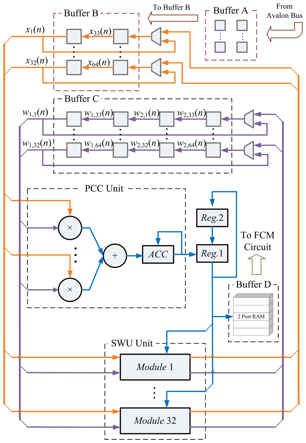 The memory unit contains four buffers: Buffers A, B, C and D. Buffer A fetches and stores spike x(n) from the main memory. Buffer B contains zj(n) for the computation in PCC and SWU units. Buffer C consists of the synaptic weight vectors, wj(n). The feature vectors, f1, …, ft, are stored in Buffer D. The Buffers A, B and C are shift registers. Buffer D is a two-port RAMfor the subsequent access by the FCM unit.