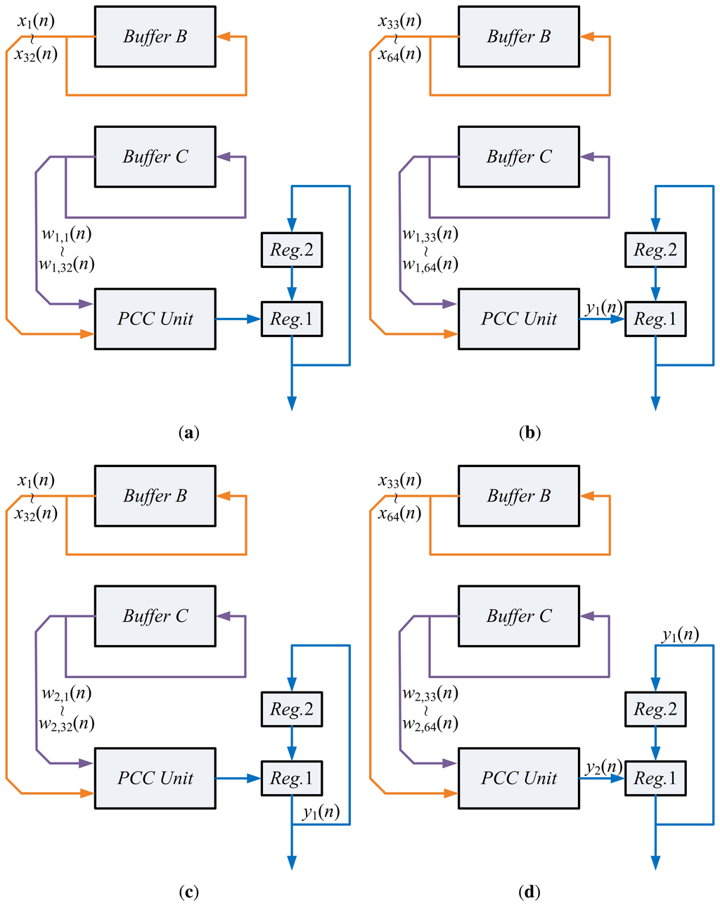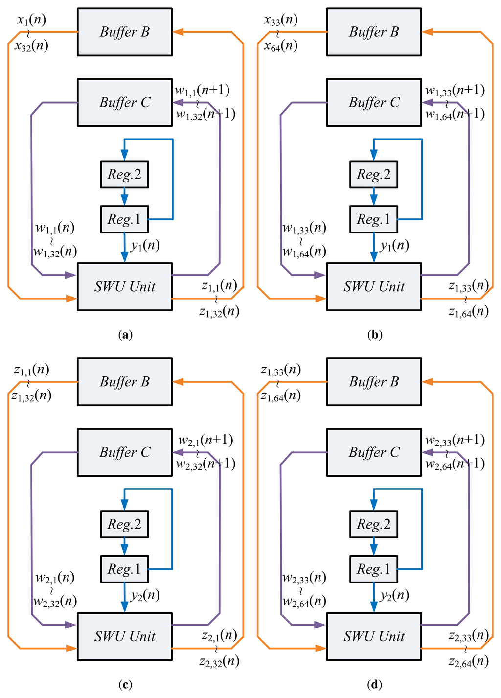 Upon the completion of PCC operations, the SWU unit will be activated in State 4. Figure 7 shows the operations of the SWU unit. Using x(n), yj(n) and wj(n), j = 1, 2, the SWU unit computes the new synaptic weight vectors, wj(n + 1), j = 1, 2, which are then stored back to Buffer C for subsequent training. Similar to the computation of yj(n), the computation of wj(n + 1) consists of two steps. The first step computes the first half of wj(n+1) (i.e., wj,1(n+1),…,wj,32(n+1)). The second step calculates the second half. These two steps also share the same circuit. Moreover, the computation of w1(n + 1) also produces z1(n), which is stored back to Buffer B. As revealed in Figure 7c,d, z1(n) is then retrieved from Buffer B for the computation of w2(n + 1).