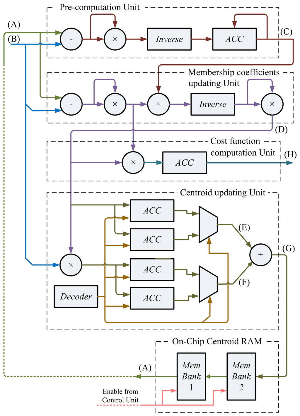 Similar to the centroid updating unit, the cost function unit incrementally computes the cost function, J. Define the incremental cost function, J(i, k), as:
