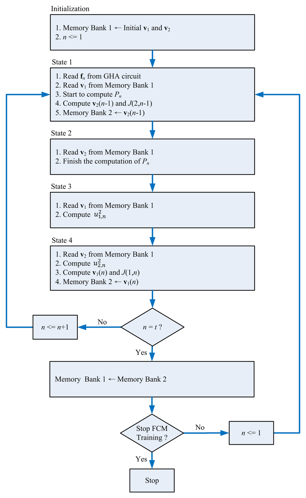 This unit is used for storing the centers for FCM clustering. There are two memory banks (Memory Bank 1 and Memory Bank 2) in the on-chip centroid memory unit. Memory Bank 1 stores the current centers, v1, …, vc. Memory Bank 2 contains the new centers, v1, …, vc, obtained from the center updating unit. Only the centers stored in the Memory Bank 1 are delivered to the pre-computation unit and membership updating unit for the membership coefficient computation. The updated centroids obtained from the centroid updating unit are stored in Memory Bank 2. Note that the centroids in Memory Bank 2 will not replace the centroids in Memory Bank 1 until all the input feature vectors, fn, n = 1, …, t, are processed.