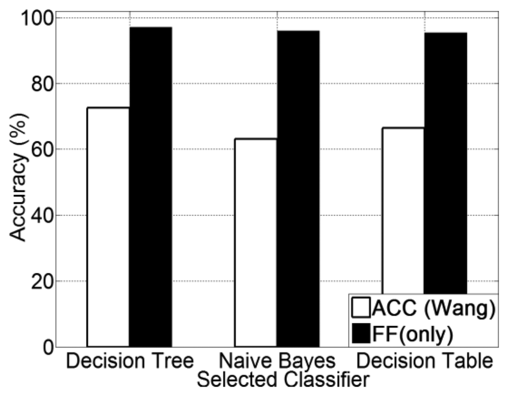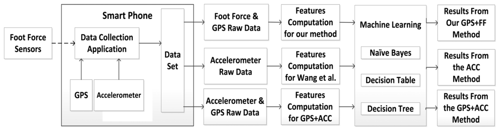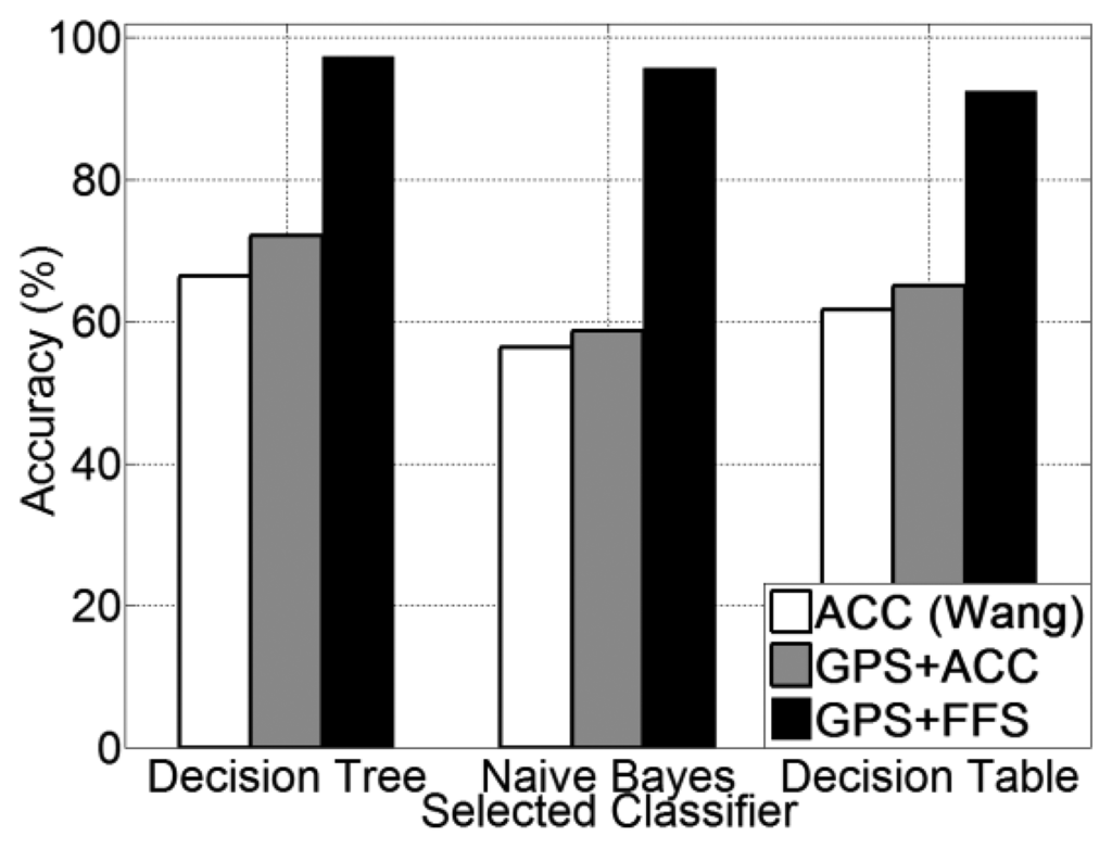 Three light-weight classifiers, naive Bayes (NB), Decision Tree (DTr) J48 and Decision Table (DTa) provided by WEKA toolkit are used to compare the performance of these three different (ACC, GPS + ACC, GPS + FF) methods (see Figure 1) [].