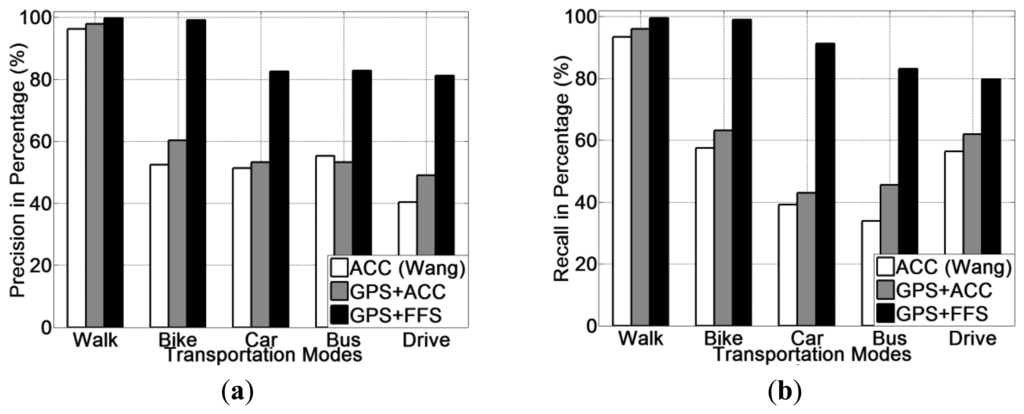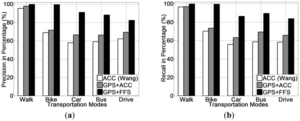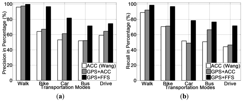 The precision and recall for each transportation mode of each classifier is presented from Figure 10, 11 and Figure 12. With respects to the precision and recall results, it must be remarked that the GPS + FF method outperforms the other two typical methods (accelerometer-based method and GPS-ACC based method) in all aspects, especially in recognising cycling and in sub-differentiating motorised transportation mode into car-passenger, bus-passenger and car-driver.