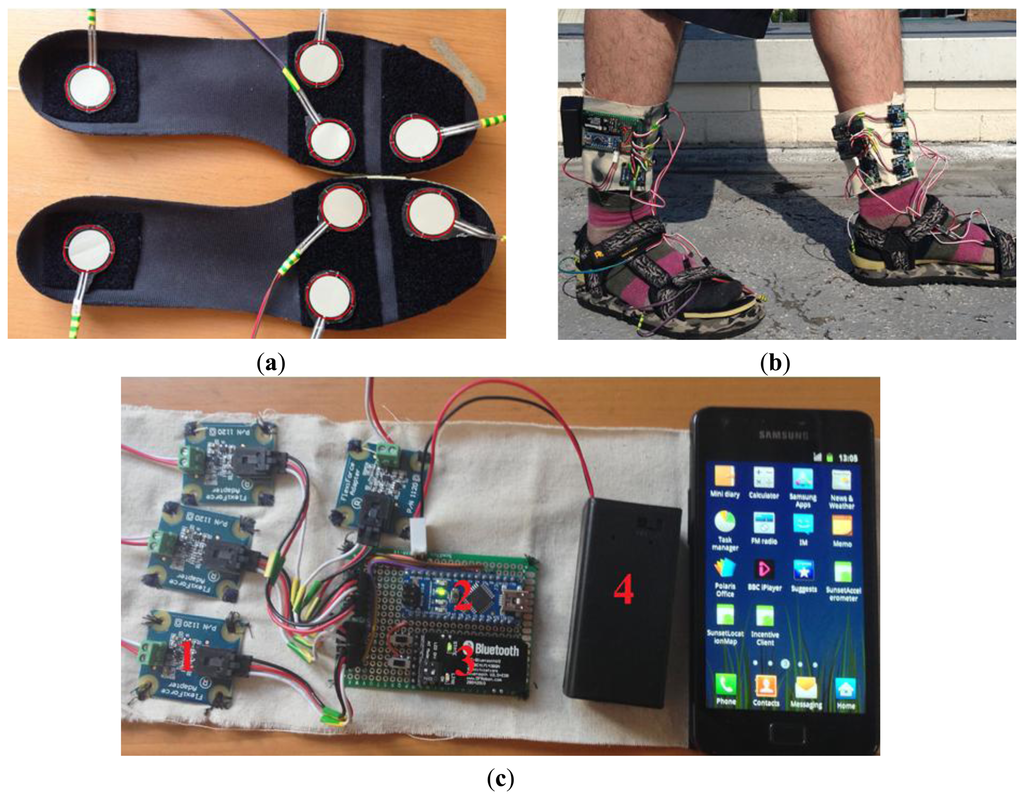 All Flexiforce sensors are interfaced to the smart phone via a Bluetooth connection from two designed foot force sensing systems (as shown in Figure 2b). The foot force sensing system (as shown in Figure 2c) is implemented using four adaptors ( http://www.phidgets.com/docs/1120_User_Guide) (marked as 1 on Figure 2c), one Arduino Nano Board ( http://arduino.cc/en/Main/ArduinoBoardNano) (marked as 2 on Figure 2c), one Bluetooth module (marked as 3 on Figure 2c), and one 9 V battery box (marked as 4 on Figure 2c).