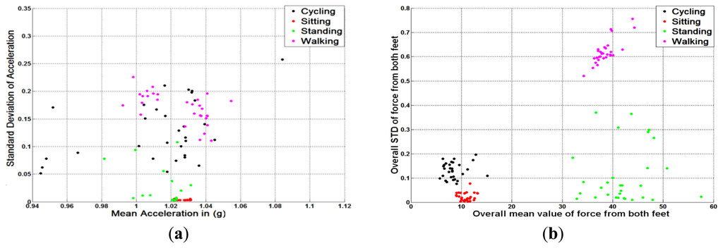 In contrast to a single wearable sensor used as a pedometer, multi-sensor types of wearable foot force sensor system can be used to capture richer and more finely grained user foot force variations caused by different human postures, e.g., standing and sitting and activities, e.g., cycling and driving in real time []. However, the use of the foot force sensors to support richer mobility activities recognition also faces significant challenges. Different mobility activities may exhibit similar foot force patterns, which can be hard to differentiate, e.g., car passengers and seated bus passengers sometimes generate quite similar foot force patterns. This can be addressed through the joint inference with other sensor types, e.g., GPS. The variability in where sensors are placed can produce different sensor measurements. This can be addressed, when it is feasible, by fixing the sensor position, e.g., using a standard shoe inset. For the same type of user activity, user movement may vary. This makes it more difficult to compare sensor readings across different subjects, because the foot force signal noise due to small body movements, such as swaying, varies. However, many mobility activities involve a regular shift of pressure between the left and right foot such as walking and cycling, the accuracy of detecting and classifying these activities can be improved if a method can monitor this pressure shift and use this to classify these activities.