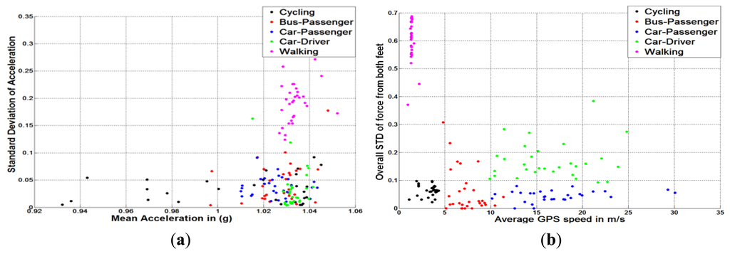 Zhang et al. [] assessed human activities such as walking, jogging and running by using a small, non-intrusive insole pressure measurement device. This can be used to estimate the speed of walking and can be used in everyday life. They studied 40 subjects and achieved a fairly high accuracy of human activity recognition (95%). One of obvious drawbacks of this work is that only user activities involving walking and running are considered. Important daily human postures during travelling such as standing, sitting are not included. Another limitation of this work is that other user mobility activities involving common daily transportation modes, e.g., cycling, motorised modes, have not been studied. Although there are obvious limitations of this work, nevertheless the potential usefulness of using foot force sensors to recognise daily user mobility activities has been illustrated.