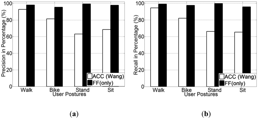To conclude, the results above show that the GPS + FF method recognised both human posture and transportation mode at the same time. The GPS + FF method achieved the overall recognition accuracy at a level of 90%, especially in detecting cycling and sub-classifying motorised transportation mode. The GPS + FF method also achieved a more fine-grained mobility activity recognition capability, in terms of sub-differentiating stationary postures into standing and sitting and sub-differentiating motorised transportation mode into bus-passenger, car-passenger and car-driving. Hence, these results also show that the GPS + FF system meet both “Wider and Fine-Grained Range Mobility Recognition Capability” and “High Mobility Classification Accuracy” requirements as depicted in Section 3.1.