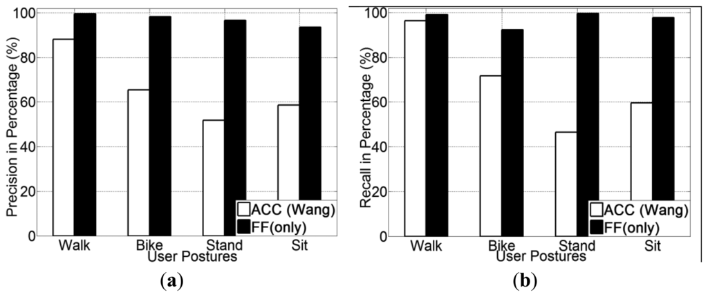 Overlapping sensor signal: Typical accelerometer-based methods can recognise human posture or transportation mode. However, accelerometer-based methods may not be able to recognise both human posture and transportation mode at the same time. This is because the acceleration signals from both user motion and vehicle vibration (during travelling) may overlap with each other []. This overlap highly affects the recognition accuracy for either human postures or transportation modes.