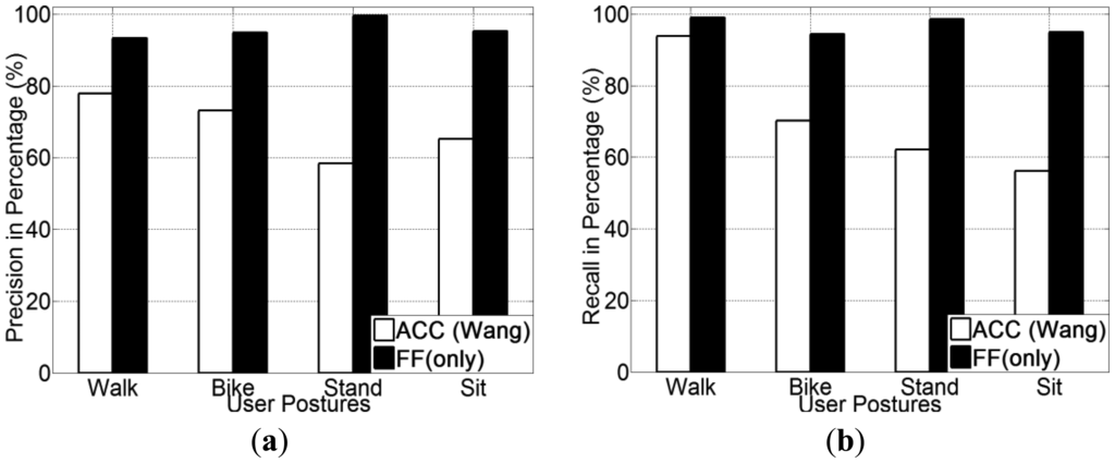 Most of the surveyed systems have restrictions depending on how users should carry their (accompanied) mobile devices except []. Work [] also recognises more activities and has more sub-classes of motorised transportation mode (bus passenger, car passenger) compared to other work, which better fits one of the aims in this paper–a wider range of mobility activity recognition. In addition, [] only used a single stage classifier which fits one of our aims in this paper, a low computational complexity (see Section 3.1). Though work [] which uses both GPS and accelerometer achieved the best accuracy, they utilised a two stage classification method, i.e., DTt + HMM. Clearly, the accuracy of mobility activity detection maybe higher if one utilises multistage classifications or more complex models. However, the objective of our work is to determine the value add of the new sensor combination of GPS + FF compared with the use of accelerometer-based methods for daily mobility activity recognition. Hence, the accelerometer-based, single-stage classifier, method used in [] is chosen as a baseline to evaluate the FF method in terms of recognising both human posture and transportation mode. As our new method (see Sections 1.2, 3.2) also uses GPS as a assistive sensor to measure speed, so the work [] is also extended to form a GPS + ACC based method by adding the GPS as a assistive sensor as well. The recognition results from this reproduced GPS+ACC method will be used to validate the GPS + FF method. The other existing GPS + ACC based methods, such as [,], are not considered because they all employed advanced classification models, e.g., the two stage classification model used in []. In addition, we believe using the same GPS speed related features in both the GPS + ACC method and our GPS + FF method, we can achieve a fair and useful comparison between FF and ACC for user activity recognition.