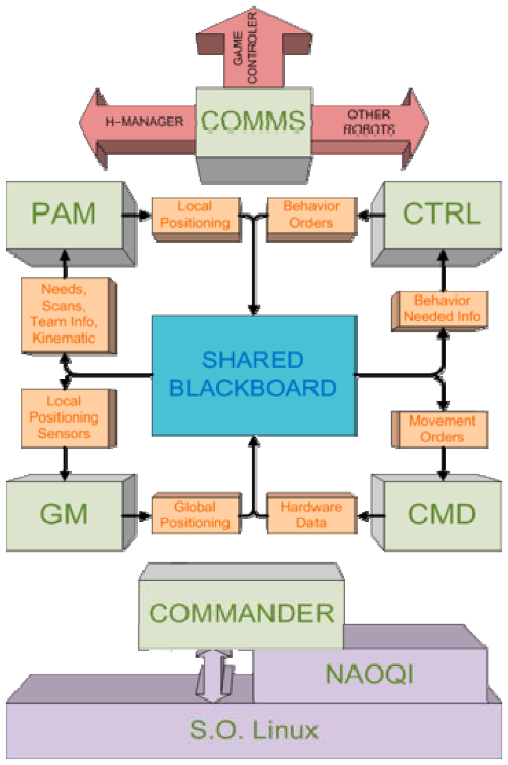 Obviously, to perform its tasks the CMD deals with the NAOqi middleware provided by Aldebaran Robotics and the OS (which in this case is an embedded Linux distribution). All the information that must be shared between distinct modules is exchanged through a shared blackboard structure.