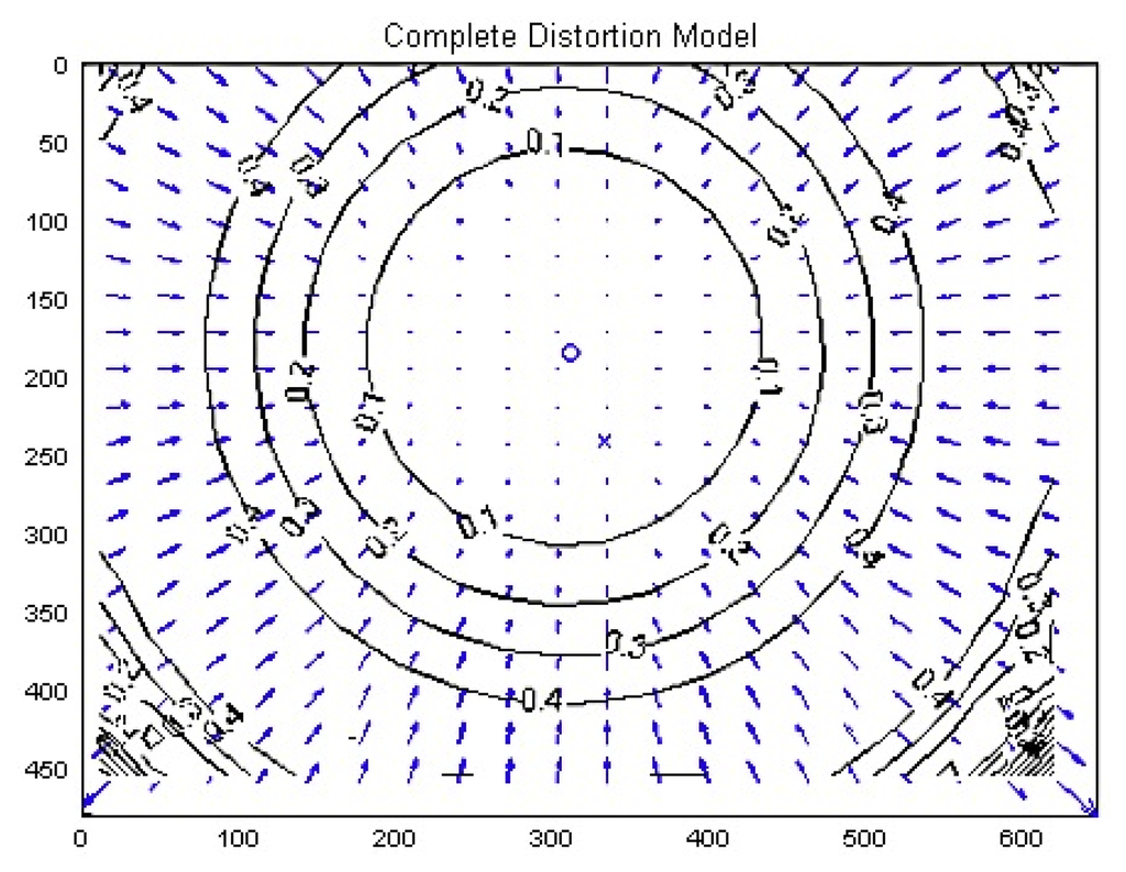 It must be also pointed out that lenses introduce additional non-linear distortion. There are several types of distortion, which can be defined as barrel or pin-cushion. The shape of the distortion in the image may vary as defined in [23]. After exhaustive analysis of the Nao camera, Figure 10 shows an example of the radial distortion of the lens.