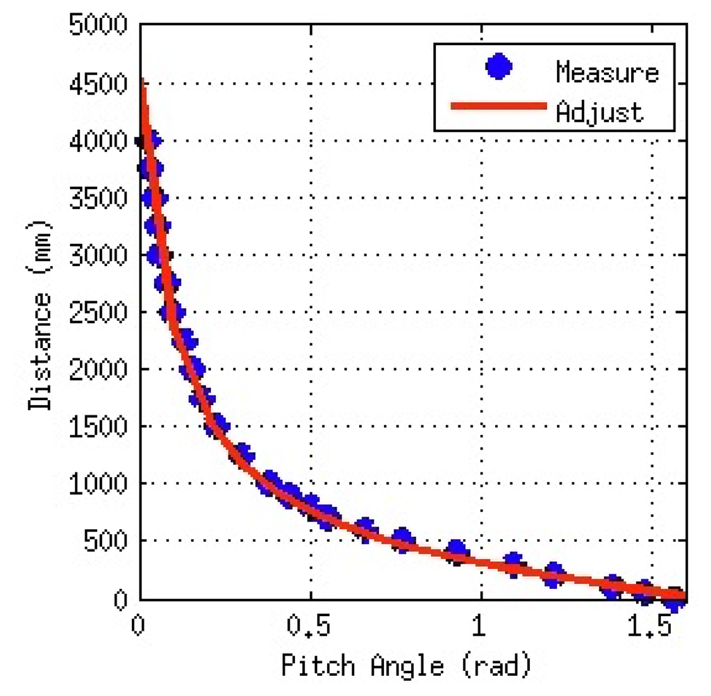 First of all, the extrinsic parameters will be obtained by making the servomotors of the camera move to locate the lines of the game field, whose distance to the robot is known because the robot's position is known. The obtained (distance, pitch angle) pairs of values measured during the camera movement are used to obtain the parameters of the polynomial adjust, as shown in Figure 11.