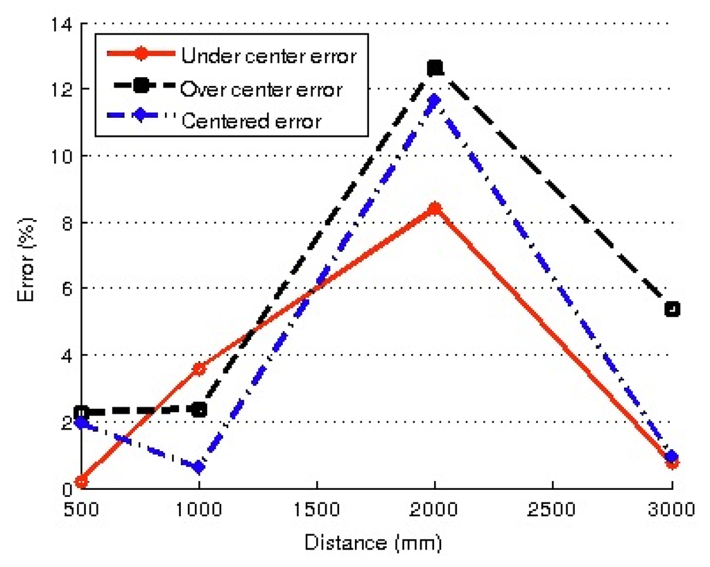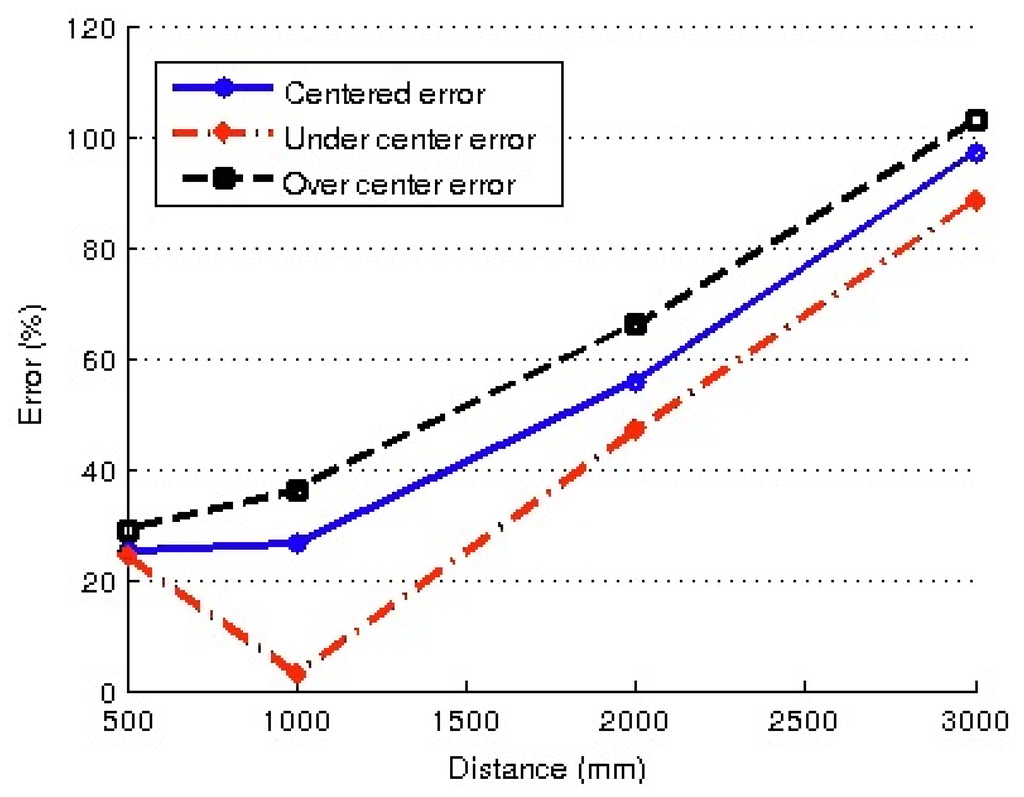 The experiments were designed as follows: firstly, the robot was manually placed at several distances from the same object, ranging between 0.5 m and 3.0 m, and the distance was estimated using simple triangulation, as indicated in Figure 8. For each position, the distance was measured by moving the head to locate the feature of interest in three positions in the image: (a) A feature located in the center of the image (centered); (b) A feature located in the lower half of the image (under centered); and (c) A feature located in the upper half of the image (over centered). These three measuring approaches were chosen to deal with different coefficients of distortion. The errors obtained for the three centering approaches are shown in Figure 13.