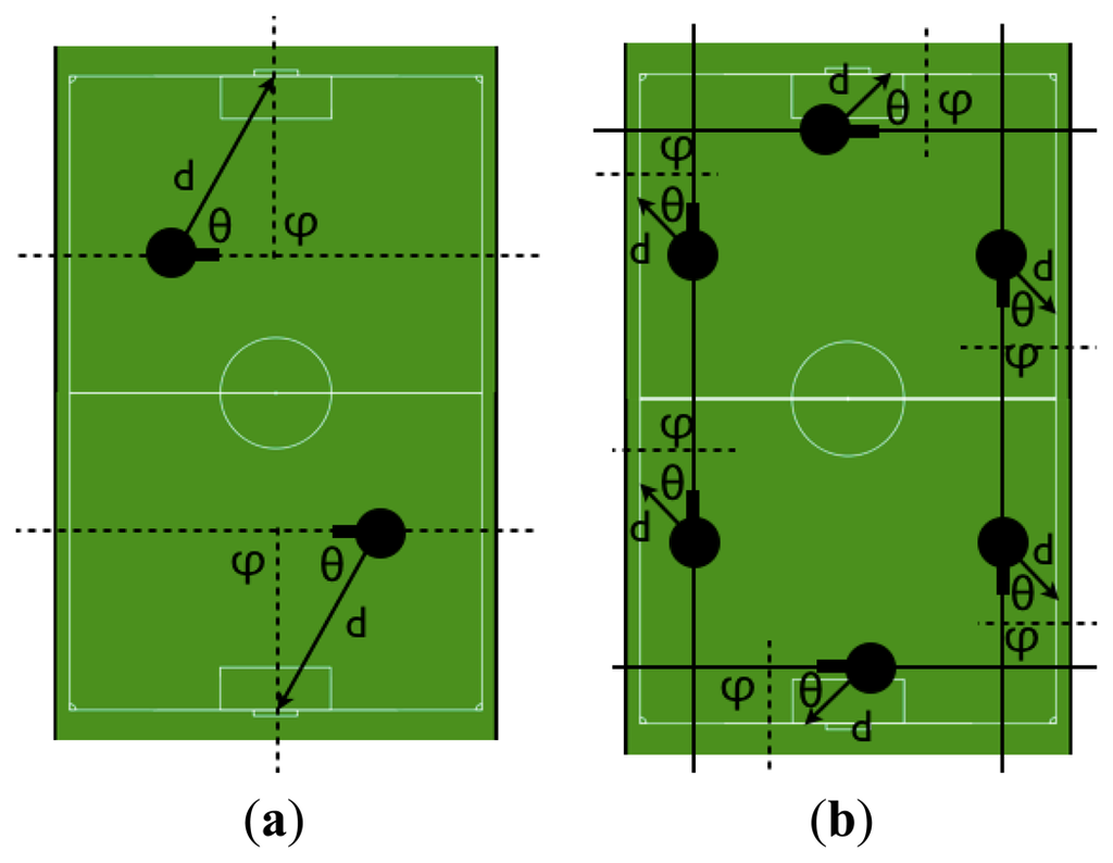 The goal position usually generates sufficient information to determine the position of the robot in the field. This measure has been defined as the relative distance from the robot current position to the goal and the inclination angle between the robot orientation and the imaginary axis passing through the crossbar expressed in the global system. By considering this information there are only two possible situations on the field, as shown in Figure 15a, but usually the result of previous estimations helps to nullify one of the options and resolving any uncertainty about the robot position.