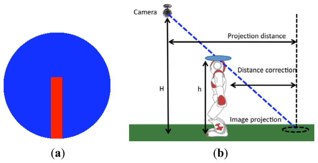 A computer vision algorithm has been developed that can detect each robot by searching on the image for a well-defined circular shape—as seen in Figure 19a. Once detected, the disk will determine the robot position and its orientation, after a correction of the viewing angle of the head of the robot (which produces a false projection on the ground). This adjustment is described in Figure 19b.