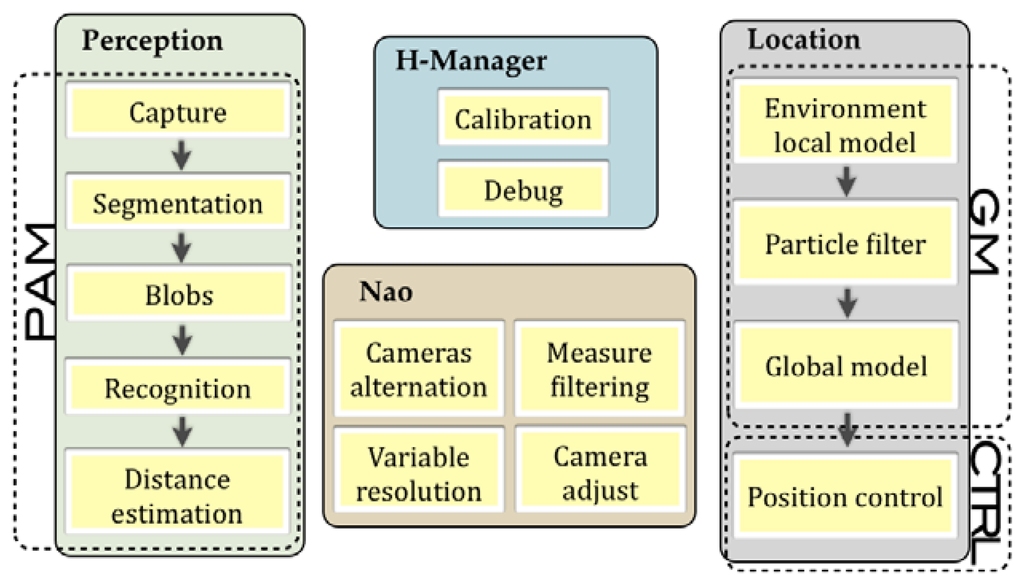 Also, a distributed management and calibration tool, known as H-Manager, has been developed to adapt the robot configuration before the football match. Moreover, this H-Manager enables a quick switch between the selected modes and behaviors.