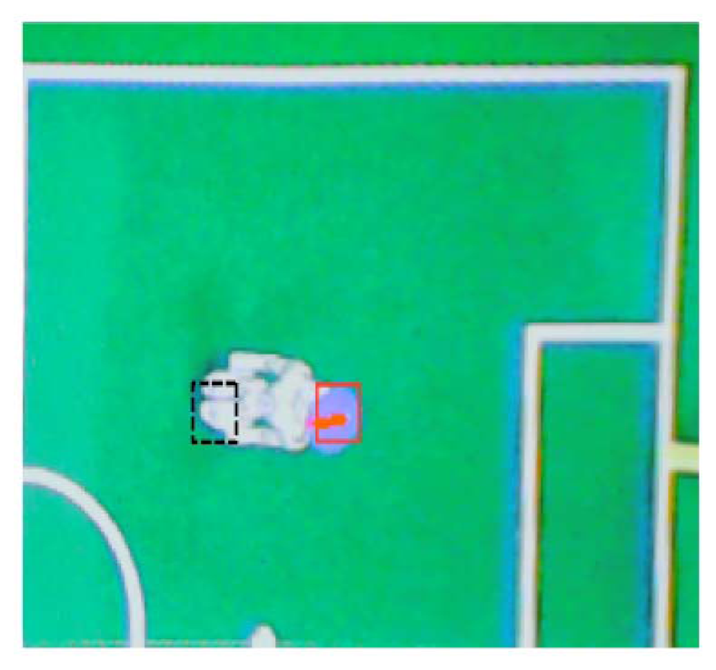 One example of a real situation is introduced in Figure 20. In that image, a robot position is detected by the recognition of the disk (red box). The corrected real position of the robot has been marked with a black box (corresponding with the feet positions).