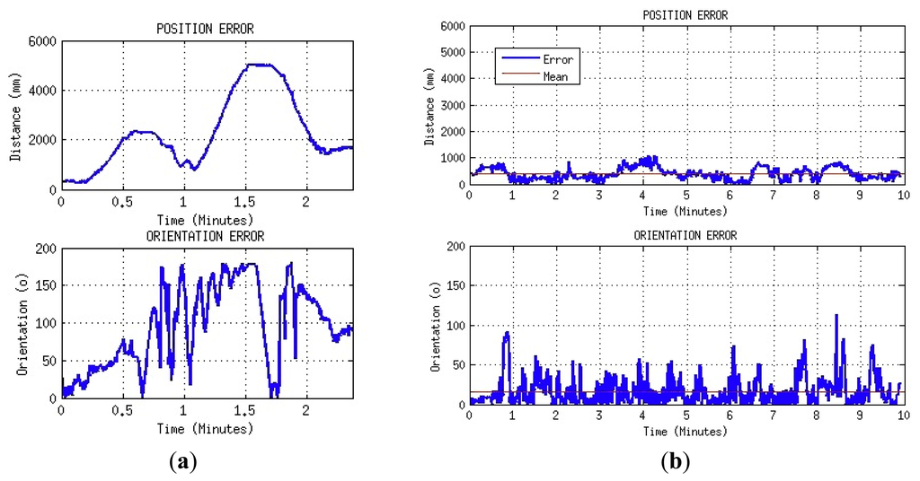 After this preliminary decision was taken, several tests with and without the proposed localisation procedure were performed to compare the results. The first experiment was intended to evaluate the accuracy of the position estimation using only odometry during a real game. During this test, the robot played in the same way it would in a regular match. The position and orientation errors corresponding to a real situation that occurred just two minutes after the game started are plotted in Figure 21a. As can be seen in these plots, the deviation obtained between the real and the estimated orientation grows to 180°, producing a mistaken identification of each half of the field. The estimated position also shows large errors of up to five meters prevent the robot from entering into useful play.