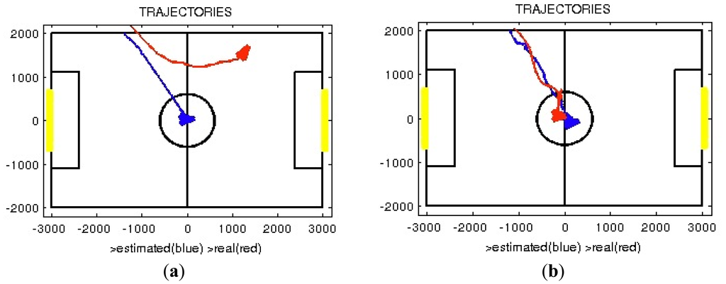 Another experiment was also conducted to evaluate the accuracy of the positioning system. The robot was situated on the edge of the game field and was instructed to go to the center of the game field. In the first test, the robot used its own odometry to do the walk, but in the second test, it used the modified particle filter. The results are plotted in Figure 22, respectively. In these figures the estimated trajectories followed by the robot (in blue) and the real trajectories (in red) are plotted on the game field, showing again major differences between the results of both tests.