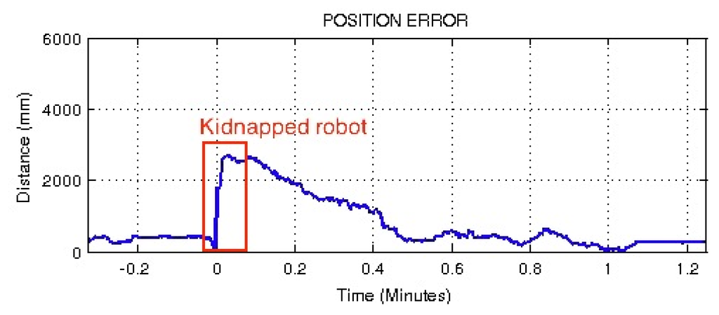 Once demonstrated the performance of the proposed localization system on the real game situation, it seems appropriate to check the performance of the filter when a ‘kidnapped robot’ situation is produced. In a new experiment, during a normal play situation, the robot was manually displaced to another position in the field that was about 3m away from the previous position. The robot used the proposed resampling PF step based on the reliability of the estimation to validate the proposed filter. Figure 23 shows that about 30 s after the kidnap, the robot had corrected its position and showed the same performance as before the kidnapping.
